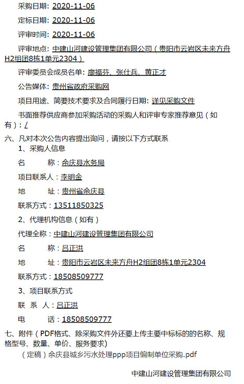 新青年工程咨詢中標余慶縣城鄉(xiāng)污水處理PPP項目編制單位采購